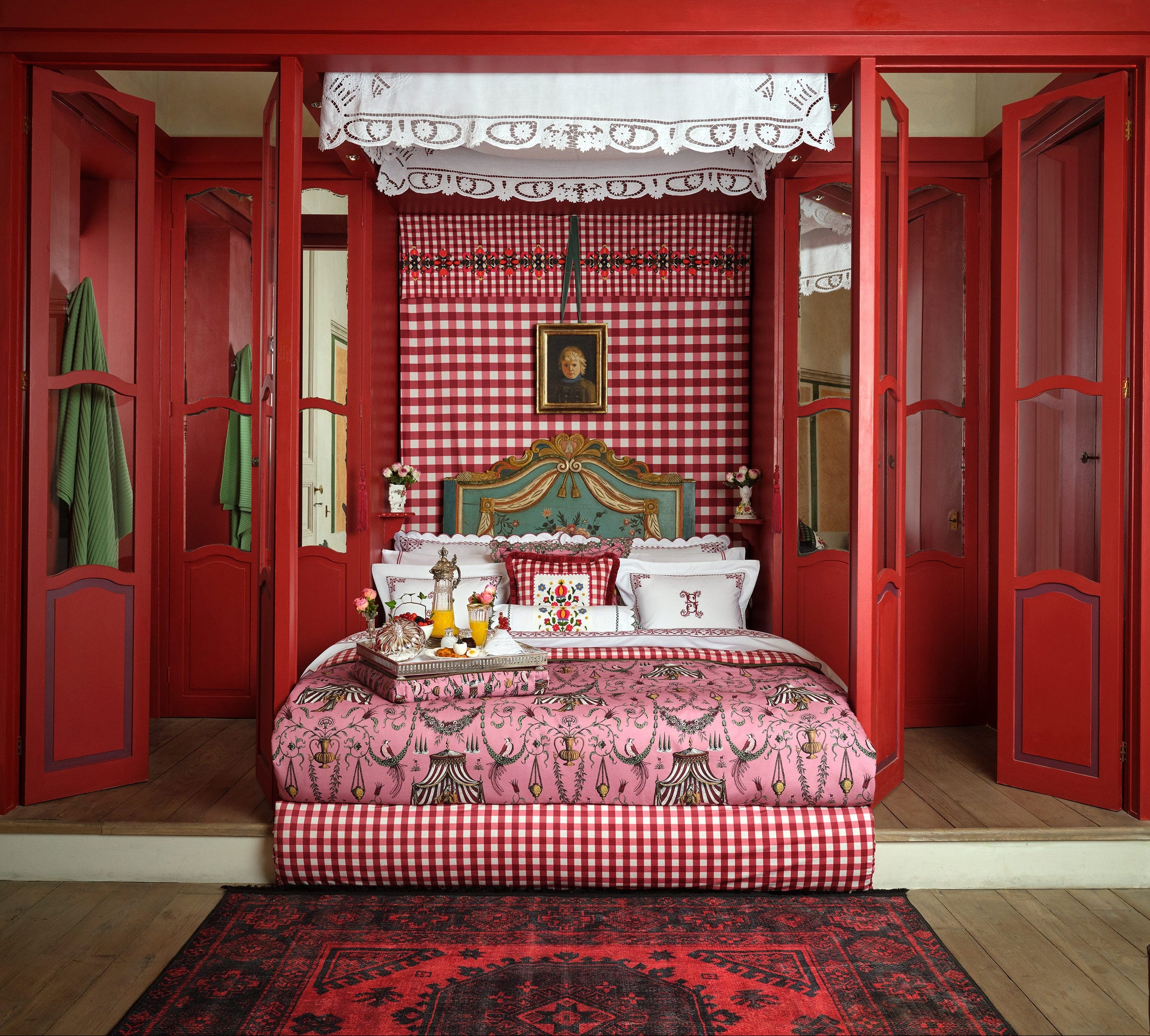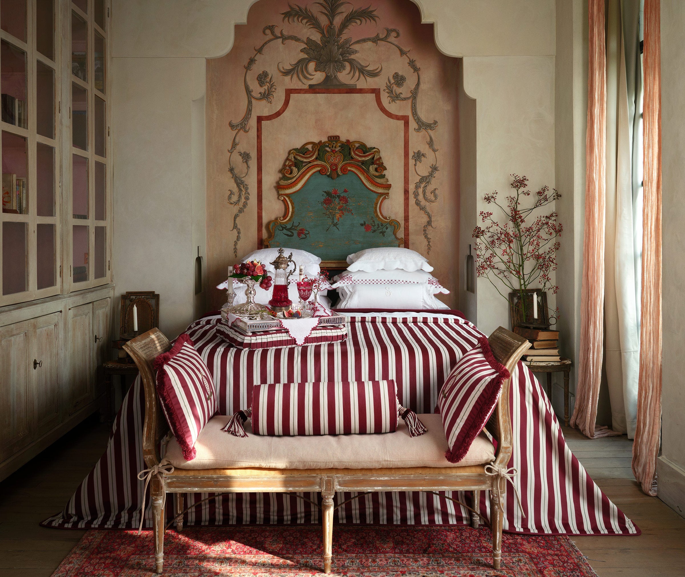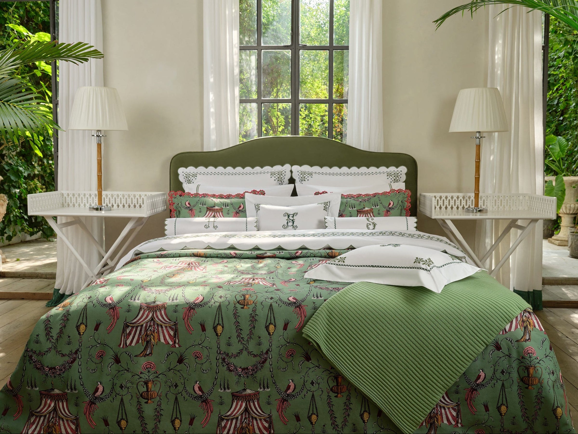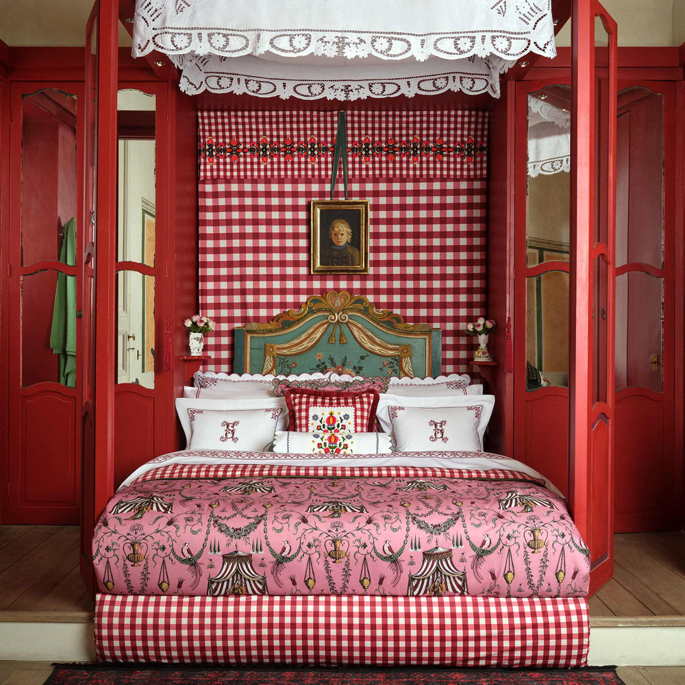 The Seferî Collection's bed linens offer designs inspired by the textures, colors, and symbols of diverse cultures. Fabrics printed with Seferî pattern, modernized tile flowers, and graphic accents of lines add a poetic touch to bedroom decor.